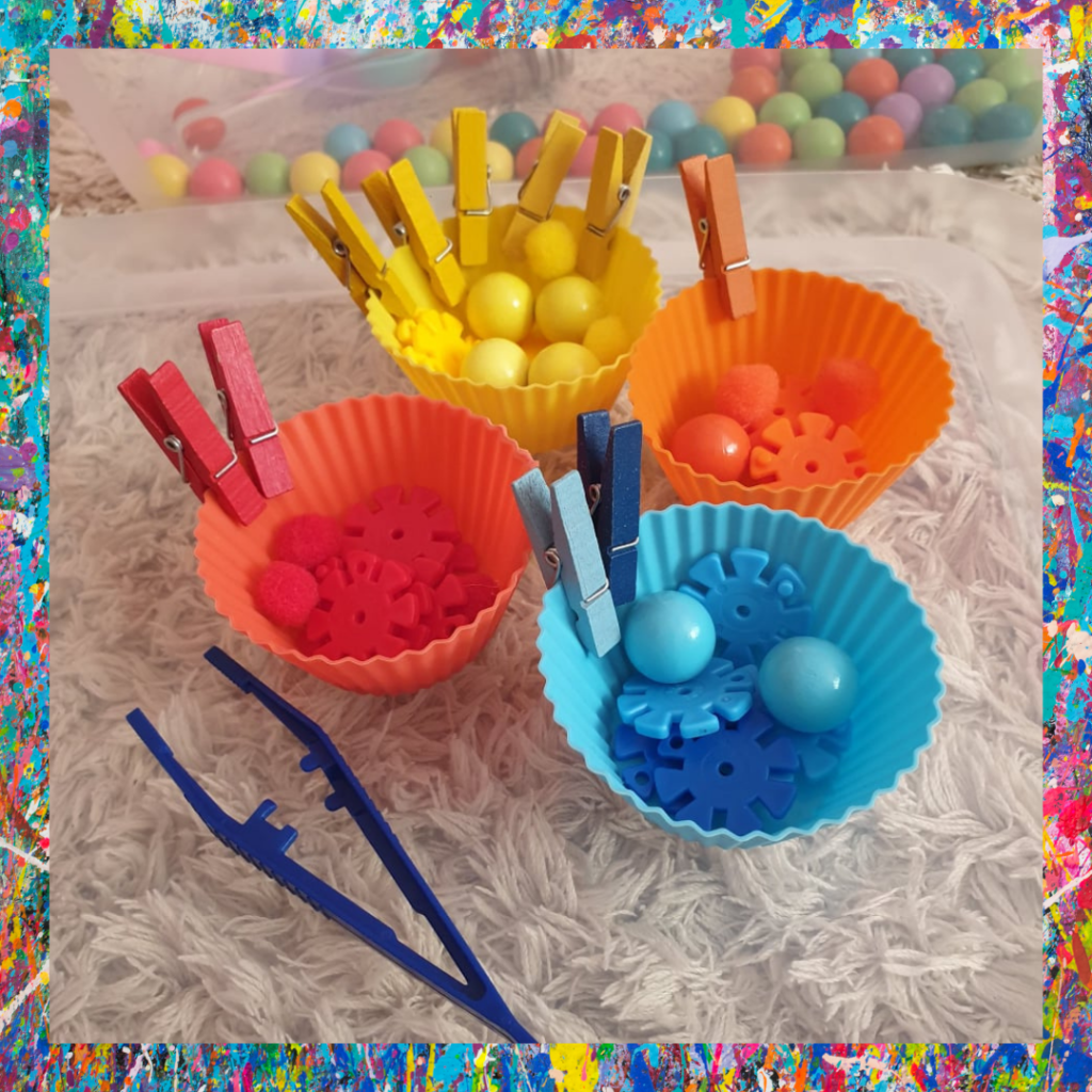 Úlohou dieťaťa bude triediť predmety podľa farby do príslušných misiek. Začnite najskôr s 2-3 farbami, neskôr pridajte ďalšie.